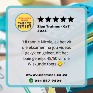 Ek het 2 volle gratis wiskunde aanlyn lesse beskikbaar gestel vir elke graad. Julle kan dit kyk om te sien of die lesse sal help en of julle daarvan hou. Dit is nie 'n 'live sessie' wat 'n sekere tyd bygewoon moet word nie, dit is beskikbaar om enige tyd te kyk.